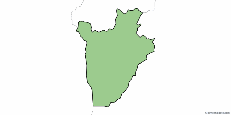 7:16:05 am Monday, October 20, 2025 Fullscreen Country: Burundi Long Name: Republic of Burundi Abbreviations: BI, BDI Capital: Gitega Time Zones: 1 Dial Code: +257 Time Zone in Burundi 7:16 am Bujumbura CAT UTC +2 7:16 am Ngozi CAT UTC +2 7:16 am Gitega CAT UTC +2 7:16 am Rutana CAT UTC +2 7:16 am Ruyigi CAT UTC +2 7:16 am Muyinga CAT UTC +2 See all Time Zones in Burundi See Holidays in Burundi Create a Calendar for Burundi Current Local Time in Locations in Burundi with Links for More Information (6 Locations) Bujumbura Mon 7:16 am Muyinga Mon 7:16 am Rutana Mon 7:16 am Gitega Mon 7:16 am Ngozi Mon 7:16 am Ruyigi Mon 7:16 am Popup Window Fullscreen Exit Burundi 7:16 05 am Monday, October 20, 2025 Need some help? Tools & Converters Meeting Planner for Gitega Time Zone Converter for Gitega Event Time Announcer for Gitega Time difference between Gitega and other locations Distance calculator to/from Gitega Display a free clock for Gitega on your website or blog Calendar & Holidays Create Burundi calendar Upcoming Holidays Oct 21 - President Ndadaye's Day Nov 1 - All Saints' Day Dec 21 - December Solstice More Holidays in Burundi Airports Bujumbura International Airport, BJM GITEGA, GID KIRUNDO, KRE